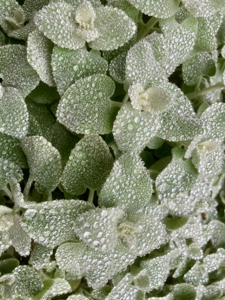 The Stachys, or Lambs’ Ears, bush next to the front door is decades old. It is so well established that it doubles in size every year with no encouragement at all. It needs not just trimming but savage pruning as soon as the flowers (much loved by bumble bees) are over. My photo doesn’t really capture the glistening freshness of the raindrops that clung to its hairy leaves after a shower.